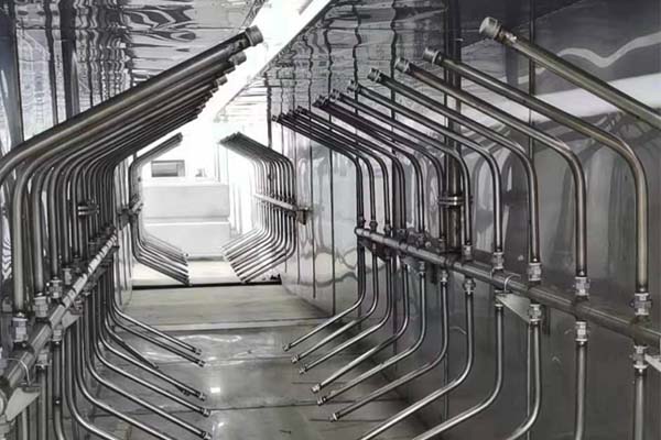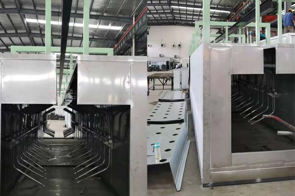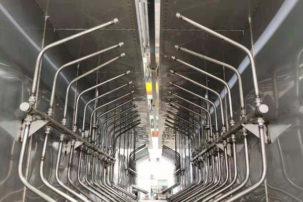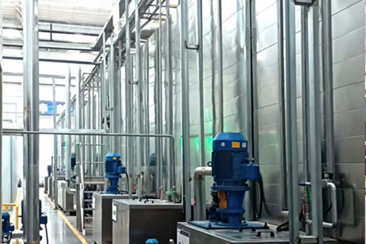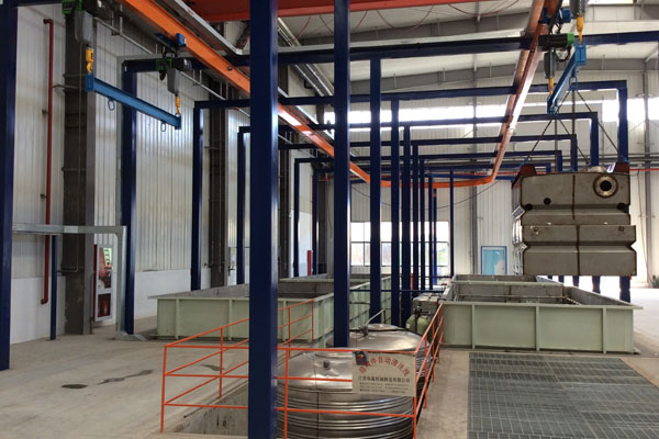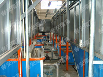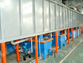 前處理生產(chǎn)線結(jié)構(gòu)特點是:前處理生產(chǎn)線各工序噴淋管布置在隧道內(nèi),噴淋由各液槽的泵來提供.各工序間都有門洞板隔開,以防竄液.各加熱液槽的加熱形式有槽內(nèi)和槽外。內(nèi)加熱器有排管、蛇形管、波紋板等;外加熱器有列管、板式加熱器等。加熱介質(zhì)有熱水 、蒸汽、導熱油等。在脫脂、磷化工序分別設有除油系統(tǒng)和除渣系統(tǒng)。為防止各加熱段隧道頂部及門洞處溢出蒸汽,在隧道頂部設有排風機。